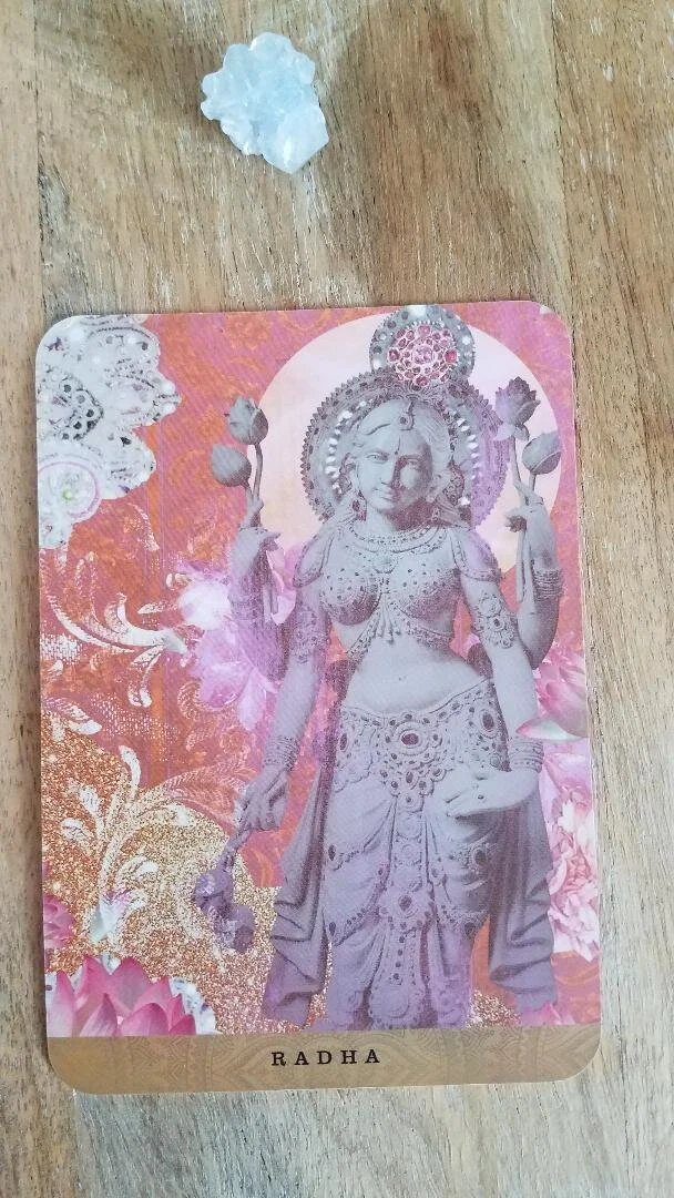 Est-ce que tu es amoureux(se) ? Si non il se pourrait que cela arrive bientôt ! Cette déesse de l'extase euphorique et de l'abandon profond, c'est ce que tu peux voir dans le regard de ton amoureux ! Elle est l'amante passionnée de Krishna, celle qui a tout abandonné pour être dans ses bras. Elle représente le désir de se fondre dans l'autre et de se perdre dans l'extase qu'est l'amour. Si tu n'es pas déjà amoureux, un grand amour est bien en chemin vers toi ❤ et déjà en train de se propager tout autour de toi. Autorises toi à t'abandonner dans la danse divine de la romance, car l'amour est simplement une expérience différente de ta propre âme dans un autre corps.